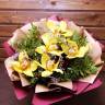 Шикарный букет из пяти желтых тигровых орхидей с обрамлением из зелени самшита и мелких сухоцветов произведет неизгладимое впечатление на девушку. Экзотическая композиция эффектно выразит ваши истинные чувства и неподдельные эмоции. В целом дизайн продуман до мелочей, от цветов до декора из крафтовой бумаги розового и бордового оттенка.